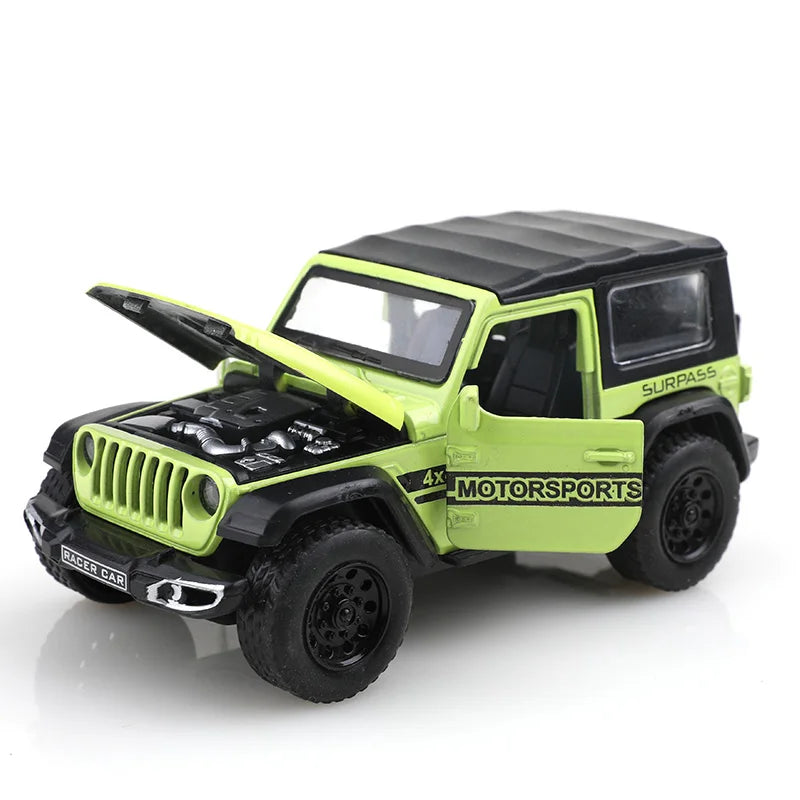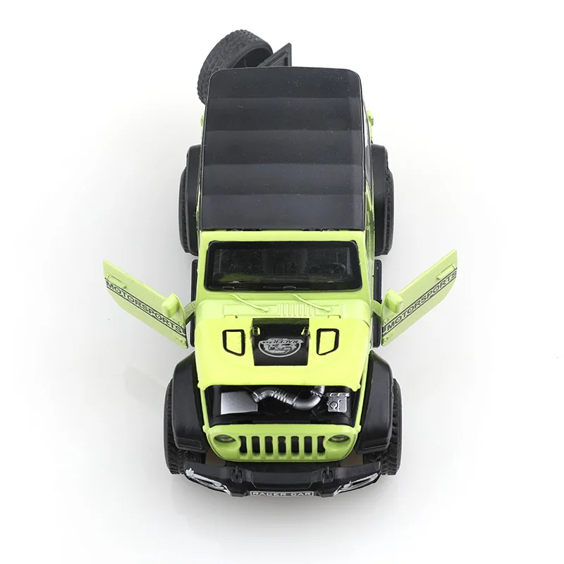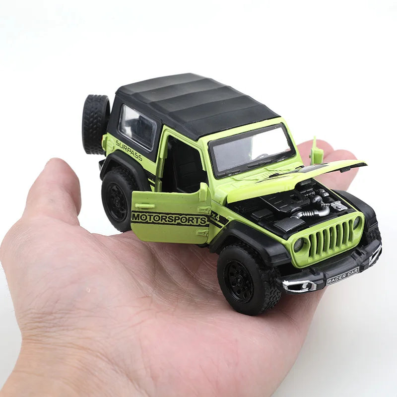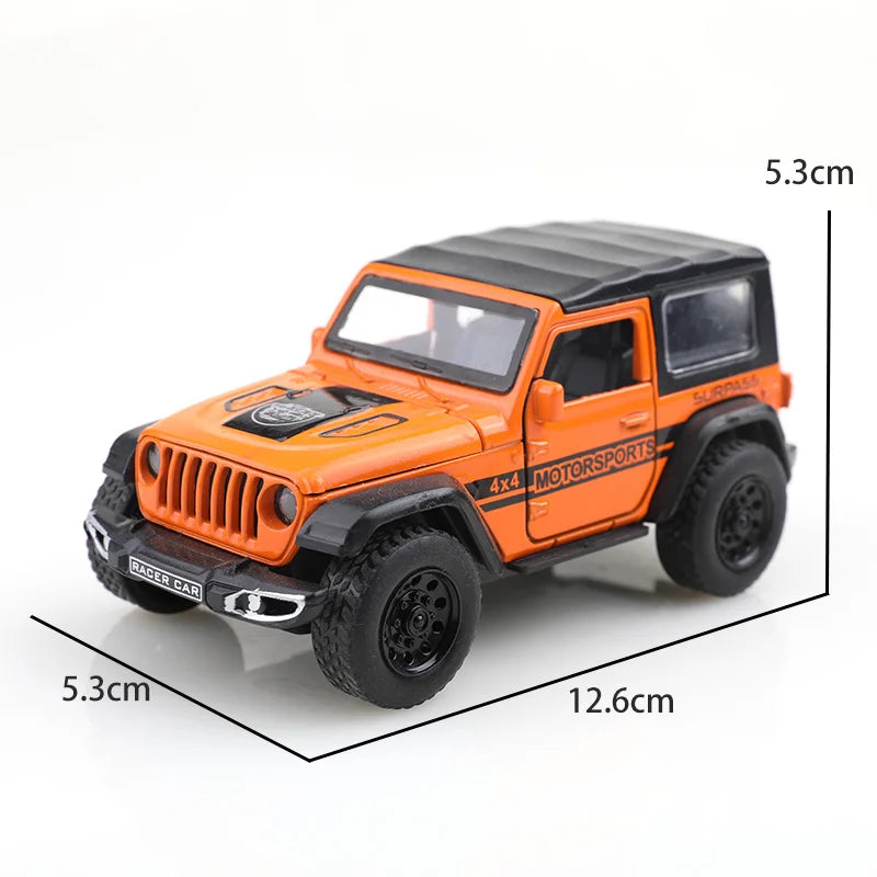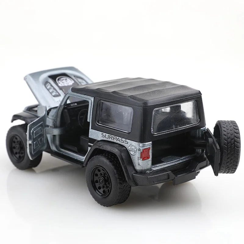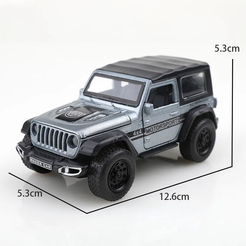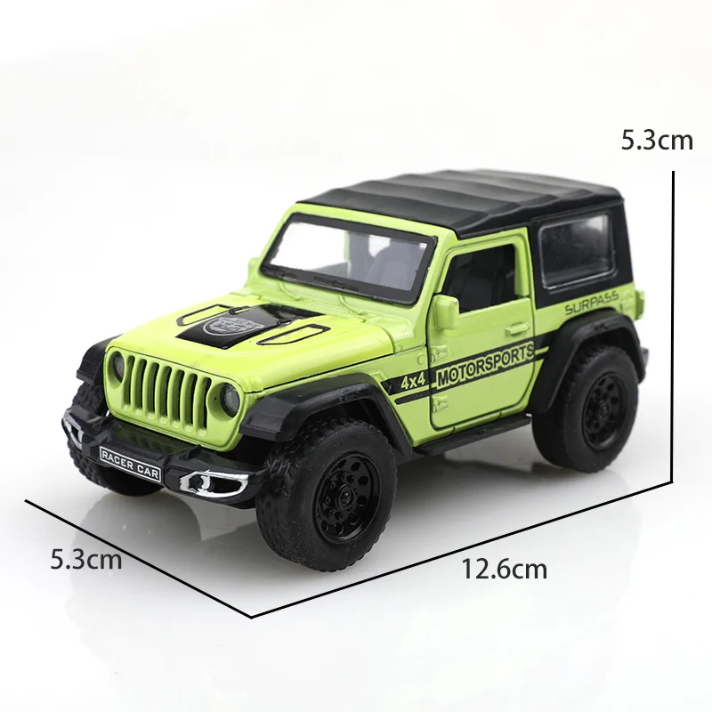 Closed-top Wrangler off-road vehicle, die-cast metal, boy's toy, four doors openable, powerful pullback mechanism.