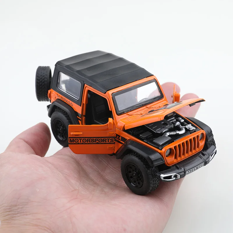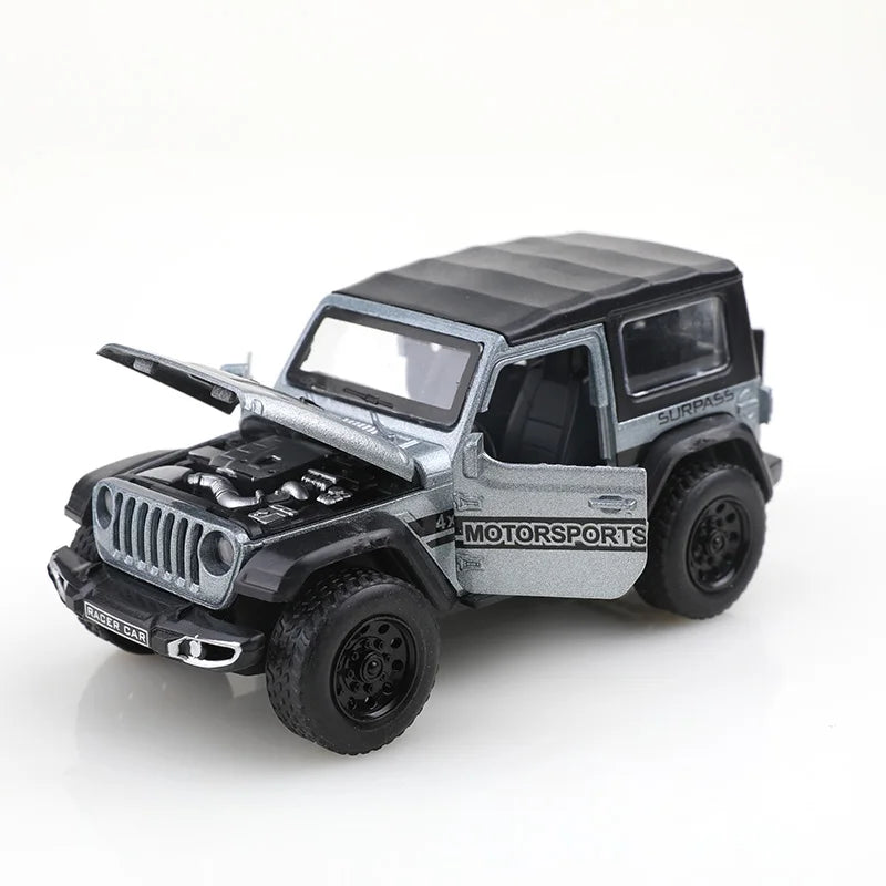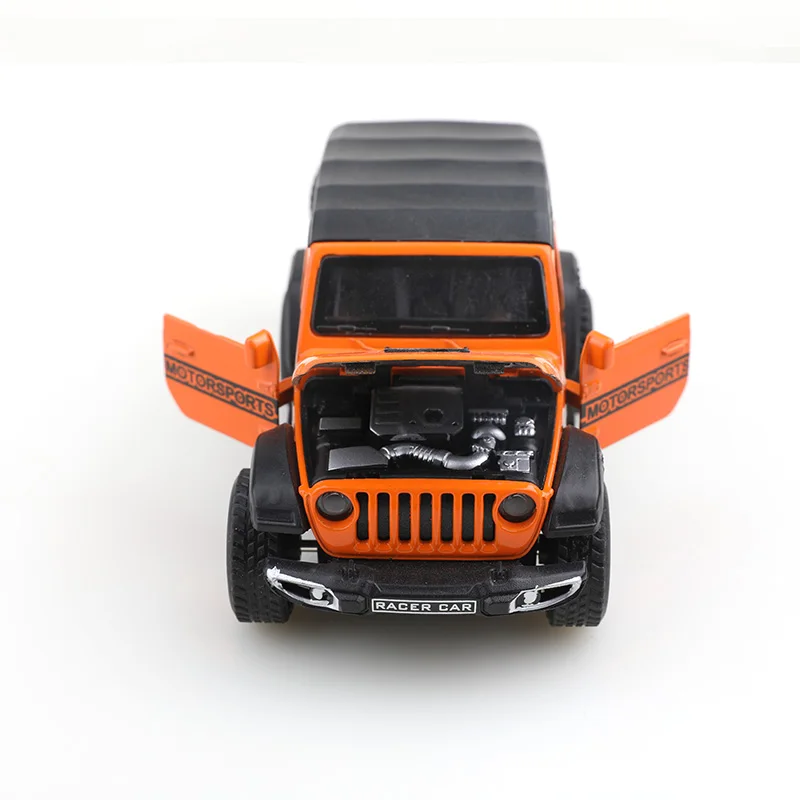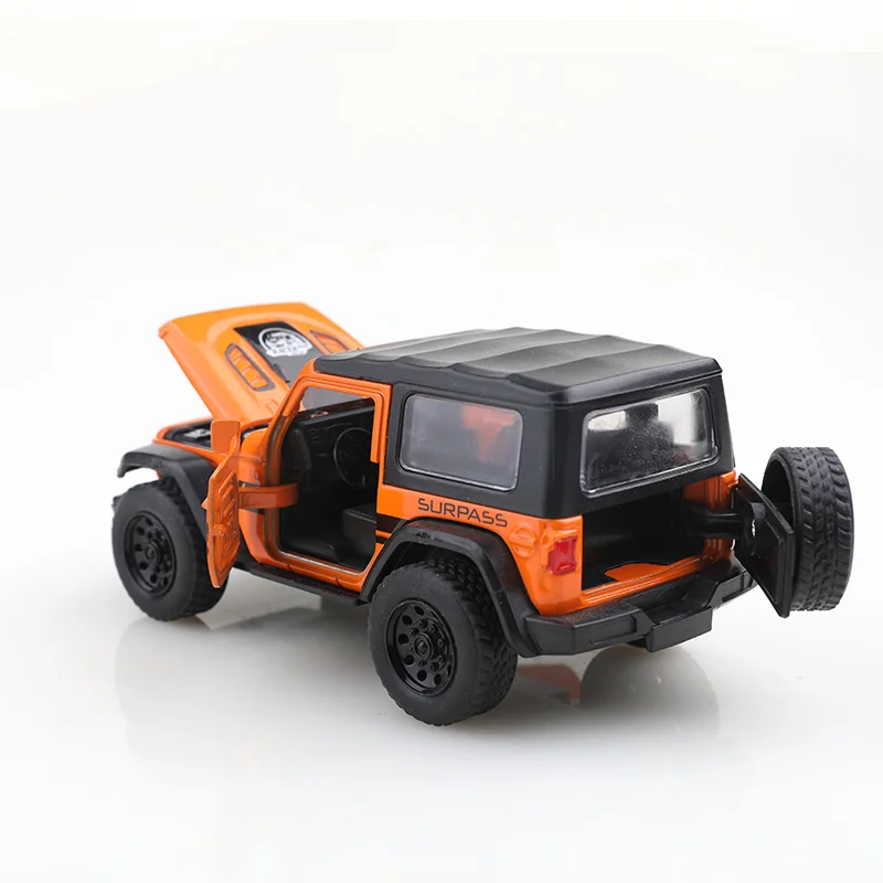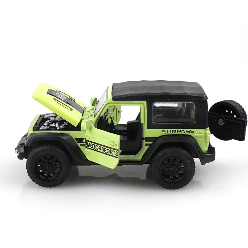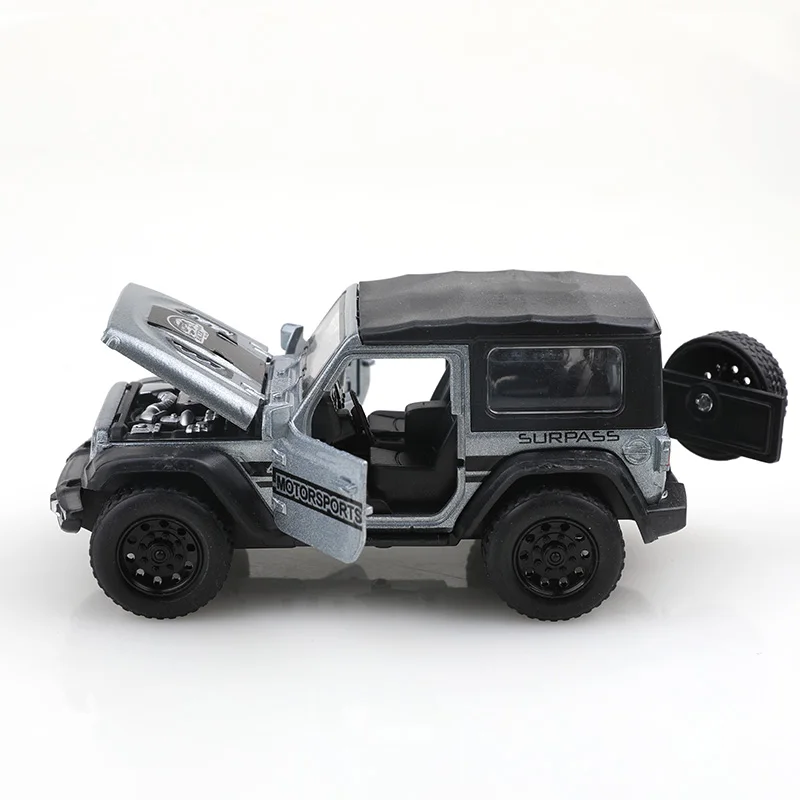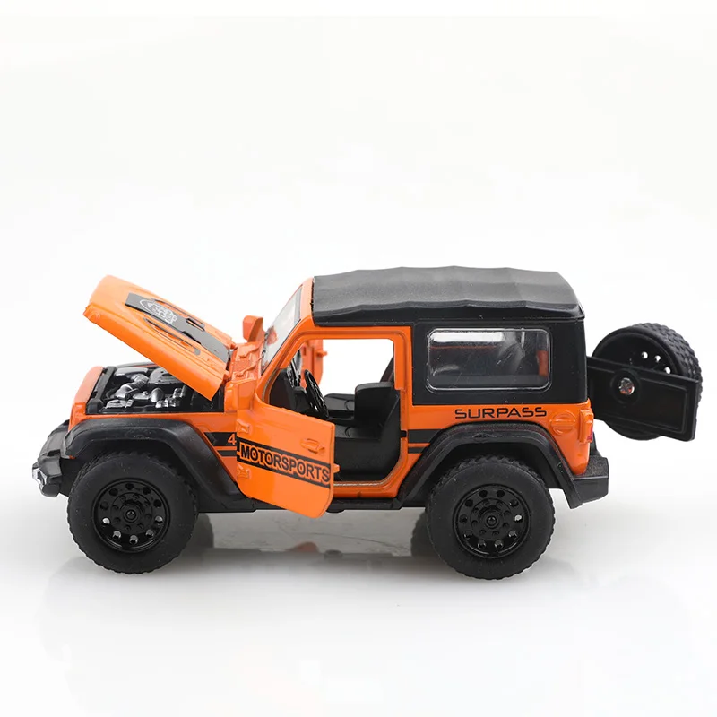 Closed-top Wrangler off-road vehicle, die-cast metal, boy's toy, four doors openable, powerful pullback mechanism.
