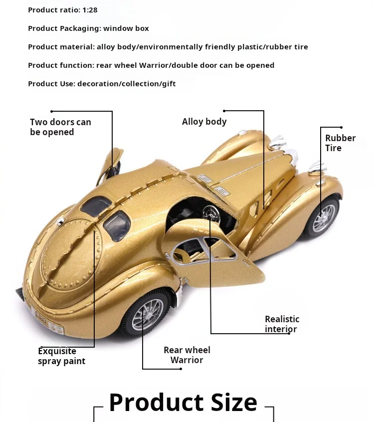 Welcome to Jetee Toy store. All products in this shop are original and authentic. Dropshipping and wholesale are welcome. Features This product is made of zinc alloy, plastic parts, rubber tires. Through CPC/CE certification, it is absolutely safe and harmless to human body. Best Gift Toy: Realistic details and smooth mechanical wheels. This is a great gift for children and adults. Genuine License: All trademarks used on this product are used under the license of their respective registered owners. Product name: Pull back car modelMaterial: body alloy, others are ABS environmentally friendly plasticsScale: 1:28Features: Door open usic on